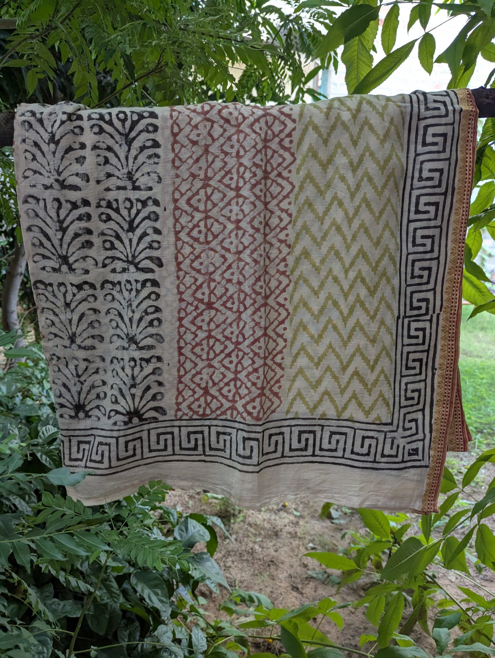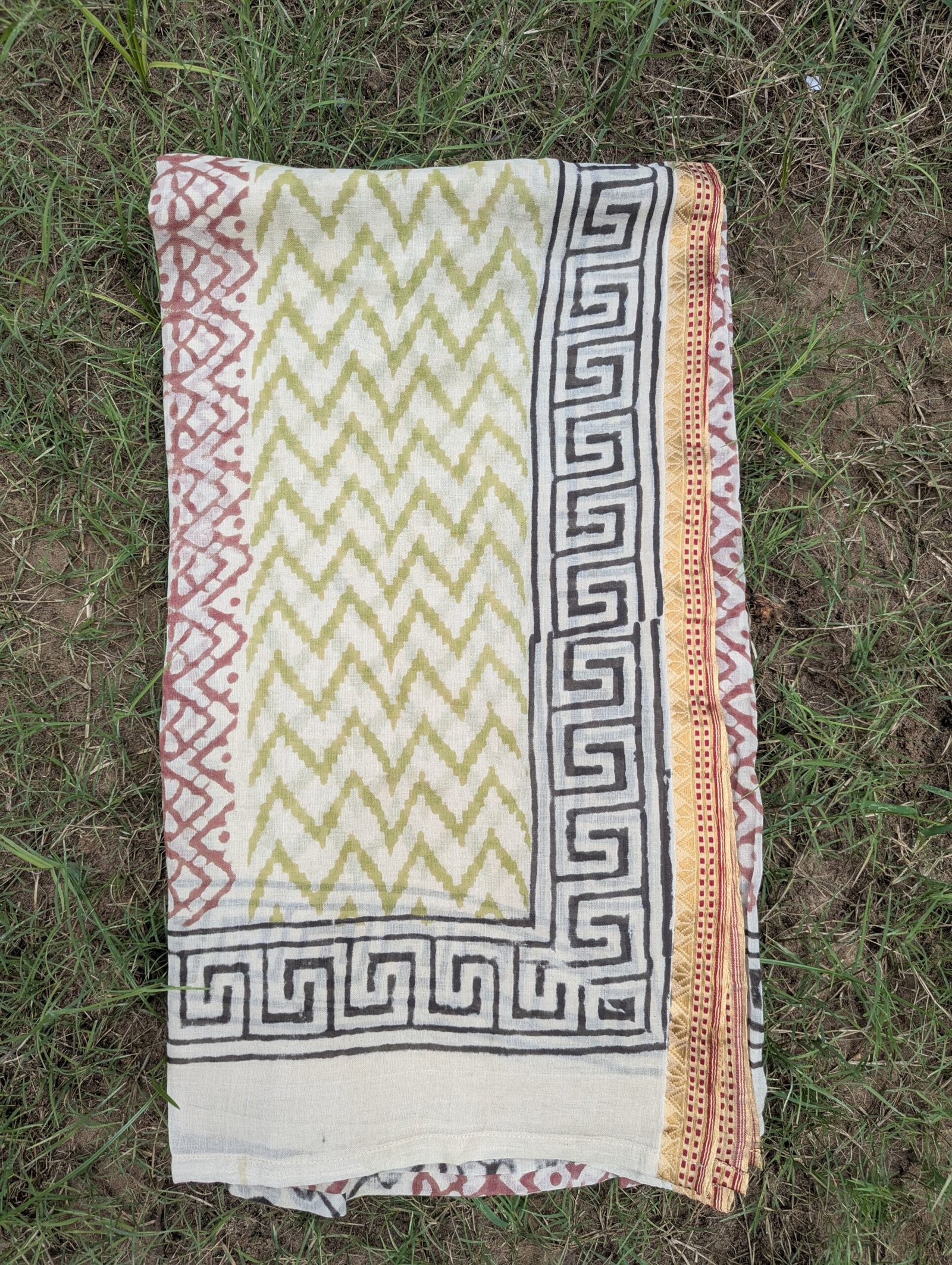 Wrap yourself in artisan tradition with this hand block printed cotton sarong, crafted by skilled artisans using natural dyes and wooden blocks. Its earthy tones and striped design make it a versatile piece for beachwear, travel, and daily styling.