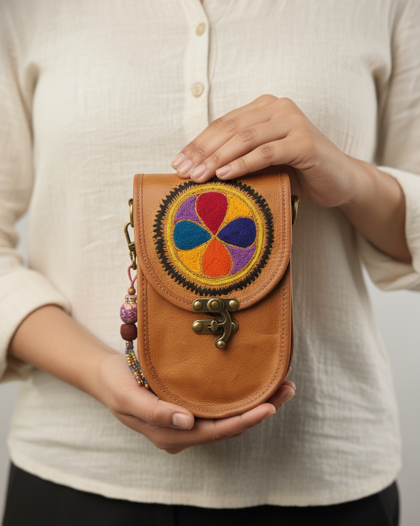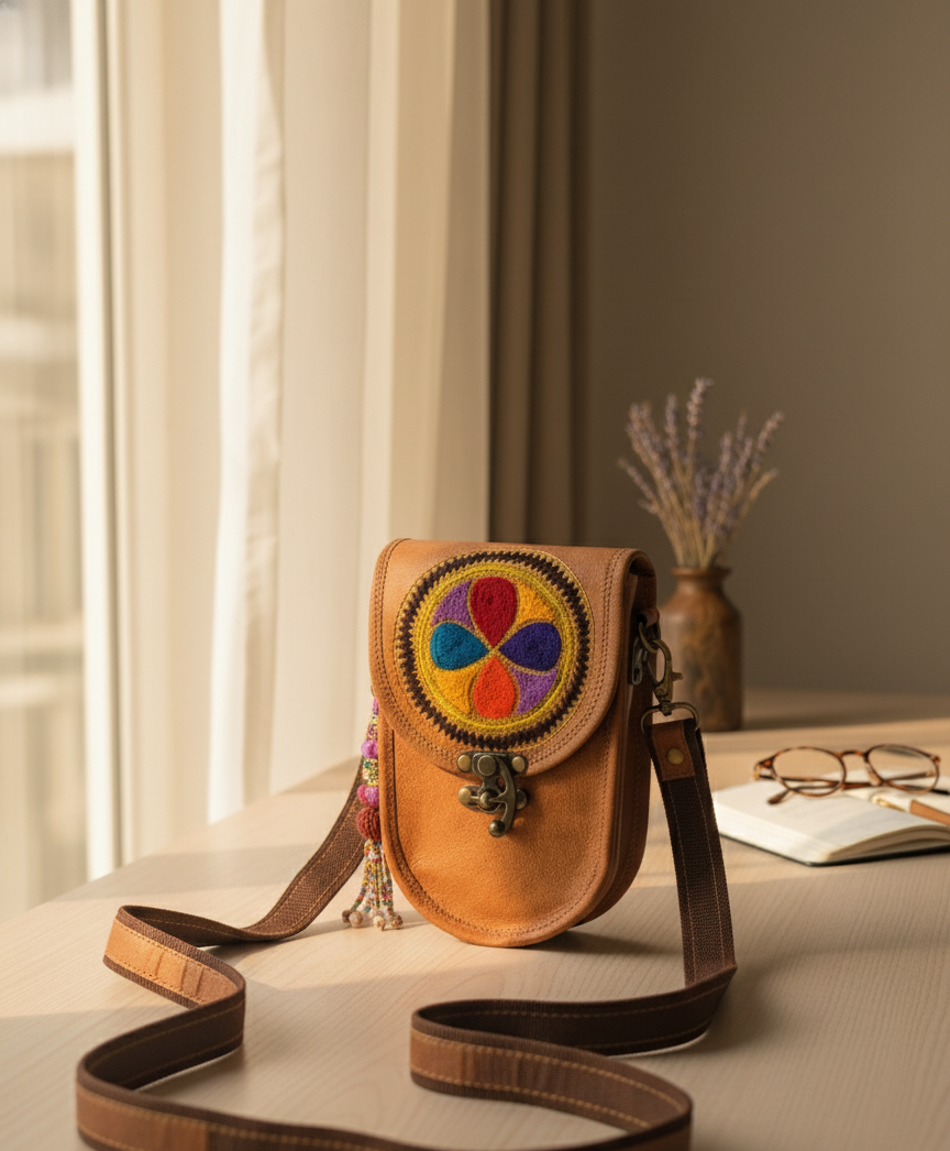 This one-of-a-kind, handcrafted leather bag is designed for the modern bohemian. It combines the natural strength and softness of genuine goat leather with a vibrant, hand-embroidered panel, making each piece truly unique. The detachable strap allows you to carry it as a stylish clutch for an evening out or as a convenient crossbody or sling bag for a day of adventure.