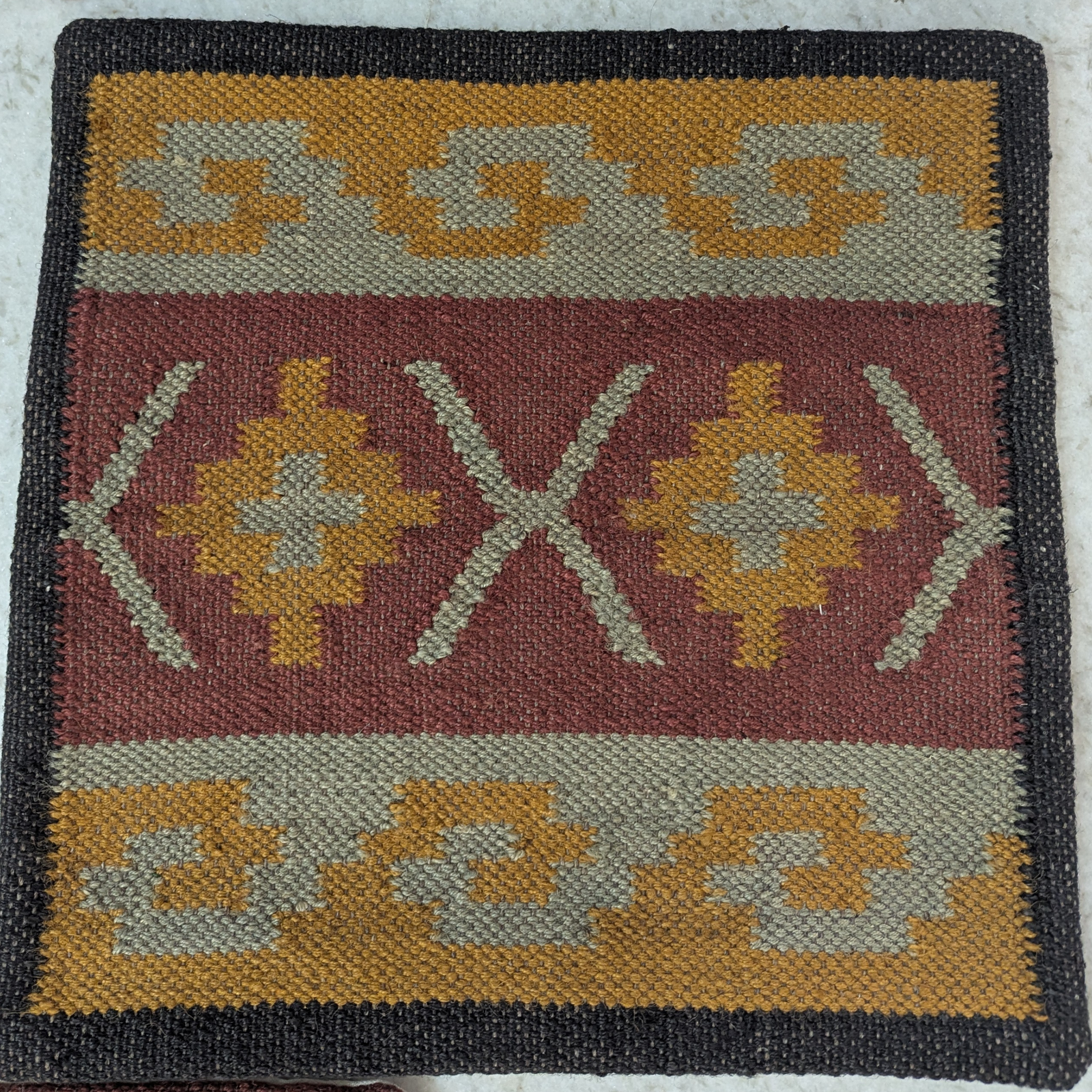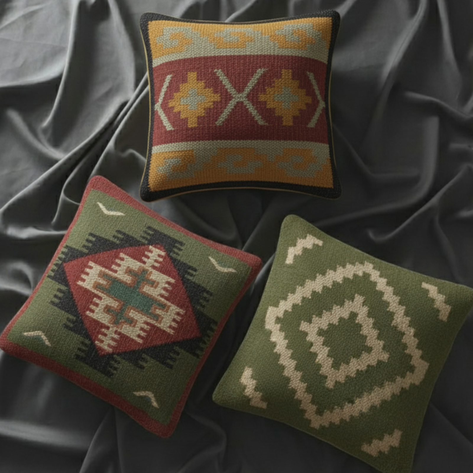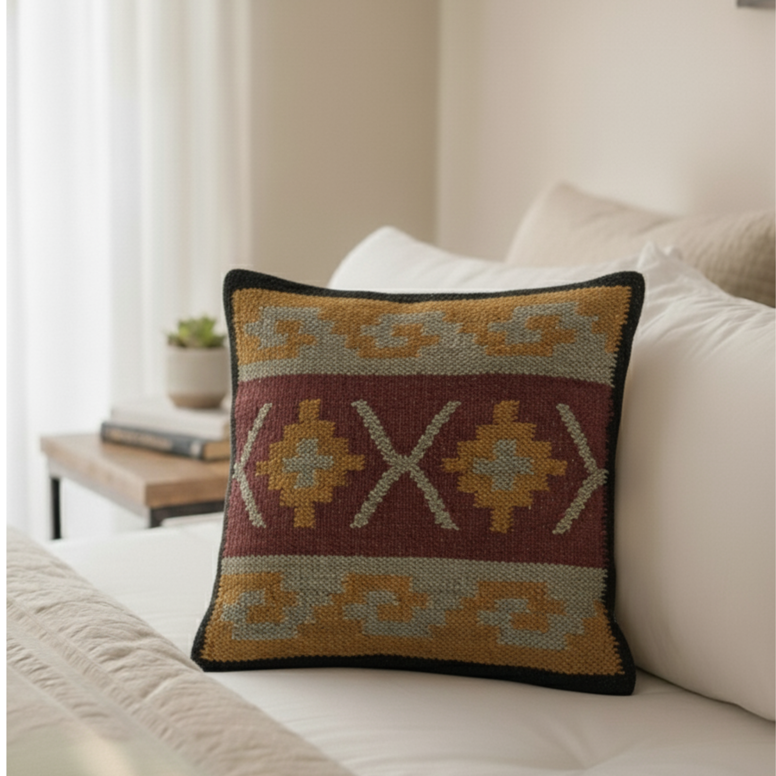 Bring earthy charm and timeless craftsmanship into your home with this handwoven jute cushion cover. Inspired by tribal kilim motifs, each piece features bold geometric patterns in rich tones of olive green, mustard, and rust red — perfect for adding warmth and texture to your sofa, chair, or bed.