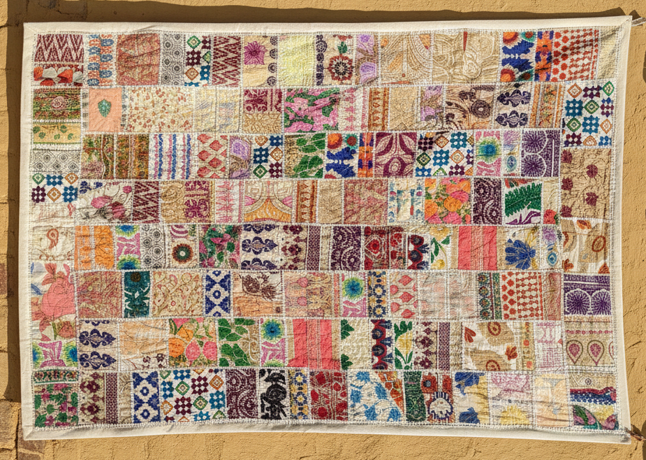 These leftover textiles were stitched into functional items such as quilts, dowry bags, cholis, and household coverings. This patchwork technique, born from practicality and scarcity, slowly evolved into a striking folk-art tradition.